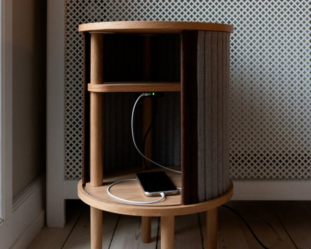 Audacious(オーデイシャス) サイドテーブルは、ホテルのベッドサイドやソファの横に置くのに最適です。テーブルの内側には、USBコンセント4個とマイクロUSB1個を備えたUSBハブが隠されているので、家族全員が同時に携帯電話やタブレットを充電できます。