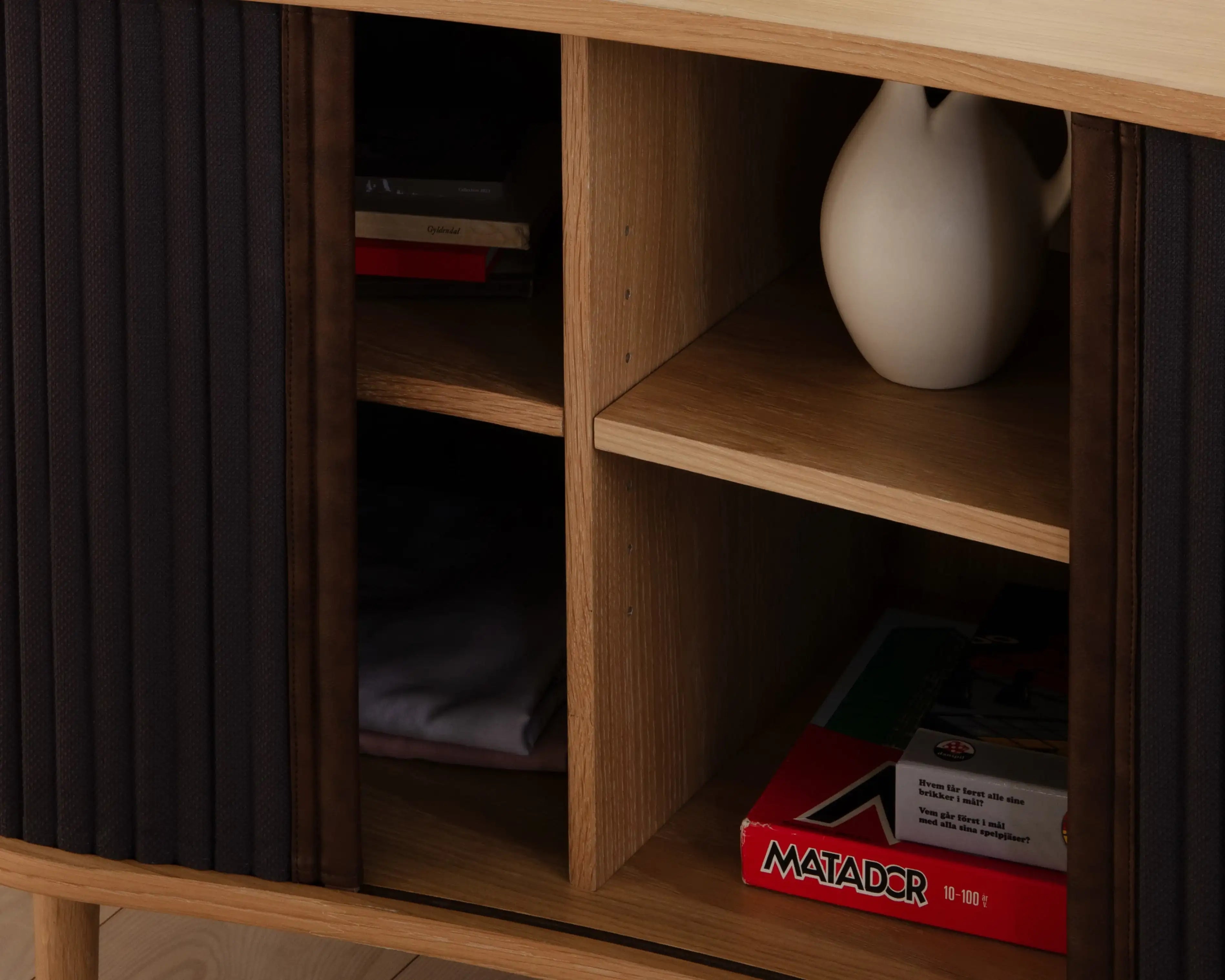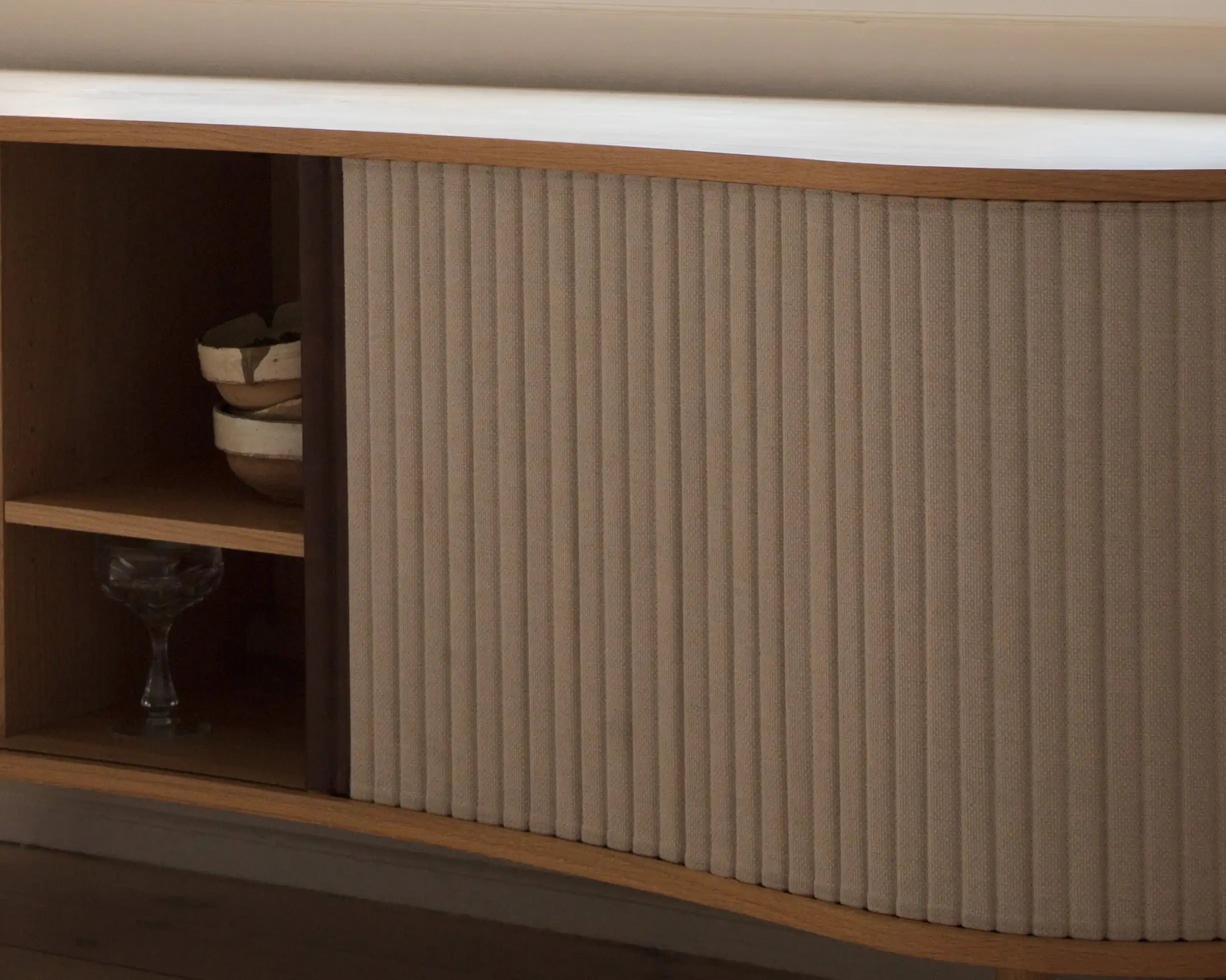 Audacious(オーデイシャス) サイドボードは、従来の収納ソリューションに少しだけ贅沢を盛り込み再構築しています。曲線的で有機的なシルエットは北欧の優雅さを呼び起こし、ファブリック張り地のスライド式タンブールドアはモダンなノスタルジアを漂わせ、過去と現在をシームレスに移行させます。